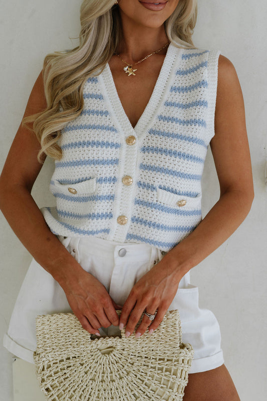 V-Neck Crochet Knit Vest-Ivory/Blue